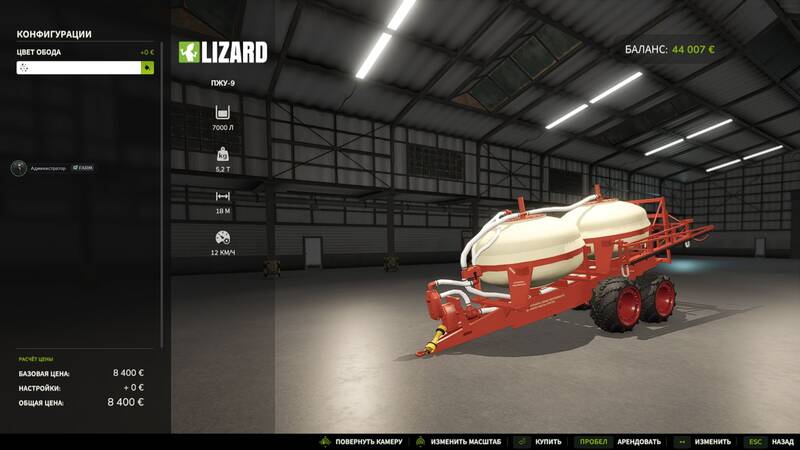 Cost: 8,500 € Operating speed: 12 km/h Working width: 18.0 m Volume: 7,000 liters
