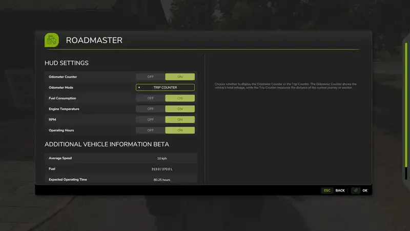 The RoadMaster mod is an essential addition, offering a comprehensive suite of data and options for monitoring vehicle operation. Key features include a unified HUD interface displaying operating hours, total and daily kilometers, fuel consumption, and more. Customize your display settings to enhance vehicle management and efficiency. Access the RoadMaster interface with 'Left Ctrl + n' and reset the trip counter with 'Left Ctrl + m'. Note: A beta feature is available, but untested on servers.