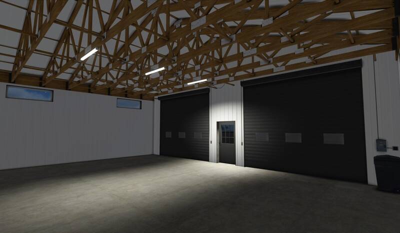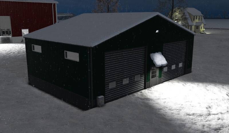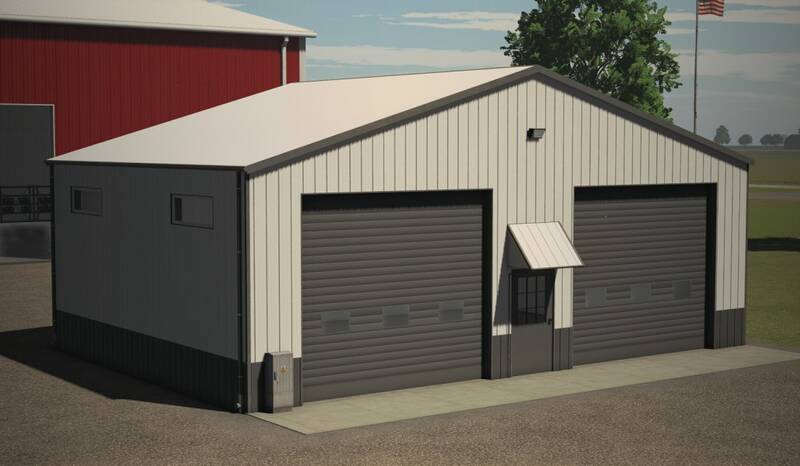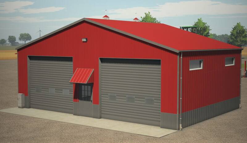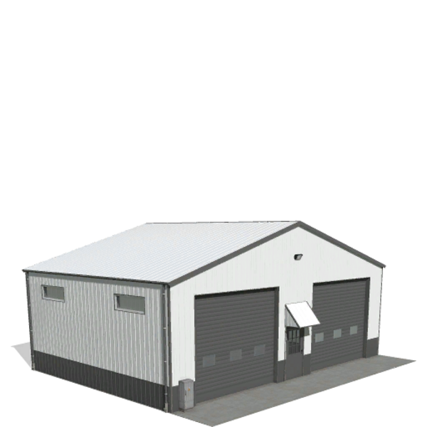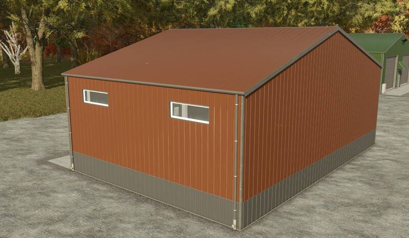 This small metal hall is perfect for storing equipment or vehicles. It features a small single roller door and a large double roller door for easy access. Interior lighting provides visibility at night, and the exterior metal color is customizable to match your farm style.